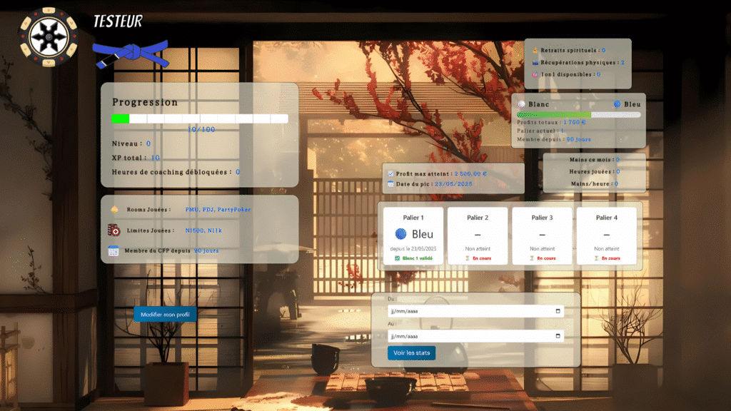 Le Dojo est un programme intensif type CFP (coaching for profit), sur candidature uniquement, pour ceux qui veulent aller encore plus loin: coachings perso déblocables via des XP obtenus en faisant du volume, volume mensuel minimum requis, suivi personnalisé, partage des profits ajustable.